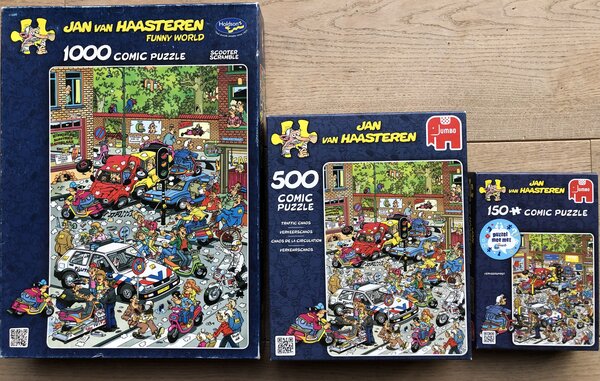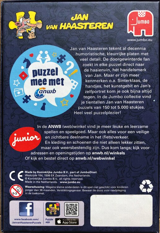 | Popis | To je jistě velmi vzácný hlavolam Jana van Haasterena. Podařilo se mi ji koupit přes Marktplaats v září 2023. Koupil jsem ji za 47 EUR. Druhá nejvyšší nabídka 42 eur. Za puzzle z druhé ruky si v zásadě účtujete 0,01 € za kus. Puzzle 150 dílků by stálo 1,50 € a toto jsem koupil za 42 €! Stále jsem se díval za příběhem této hádanky. Existuje další hádanka ANWB, a to 'kempování zábava' s číslem 81456, obě vyšly v nákladu 150 kusů. Ale skládačka 'Camping fun' je o něco vzácnější, a proto dražší než 'Traffic fun'. Tato skládačka 'Traffic Fun' má číslo 81457. Mohl jsem si je také koupit současně, a tak jsem je opravdu chtěl mít oba. A povedlo se! Tyto puzzle jste si ale mohli koupit v obchodech ANWB v roce 2015, ovšem v limitované edici a nebyly dlouho v prodeji, proto na ně téměř nenarazíte. Nic moc jiného zvláštního, co je třeba zmínit. Puzzle 'Traffic Fun' je založeno na kresbě Traffic Chaos, kterou nakreslil Jan van Haasteren v roce 2013. Vpravo dole na této skládačce o 150 dílcích je také vidět rok 2013. Zatímco tato hádanka byla vydána teprve v roce 2015; kresba tam byla dříve. Úpravy motivu ANWB provedl Dick Heins a můžete to vidět například na poznávací značce policejního auta, kývnutí na Dickovu ženu Cindy (toto otvírání očí díky Kees Poppes z facebooku Jan van Haasteren Fórum!). Tato hádanka 'Traffic Fun' byla také vydána v následujících variantách: